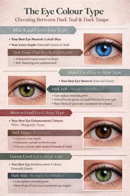 Dark Teal and Dark Taupe are two powerful wardrobe colours, but which one works hardest for you if you are an Eyes colour type?