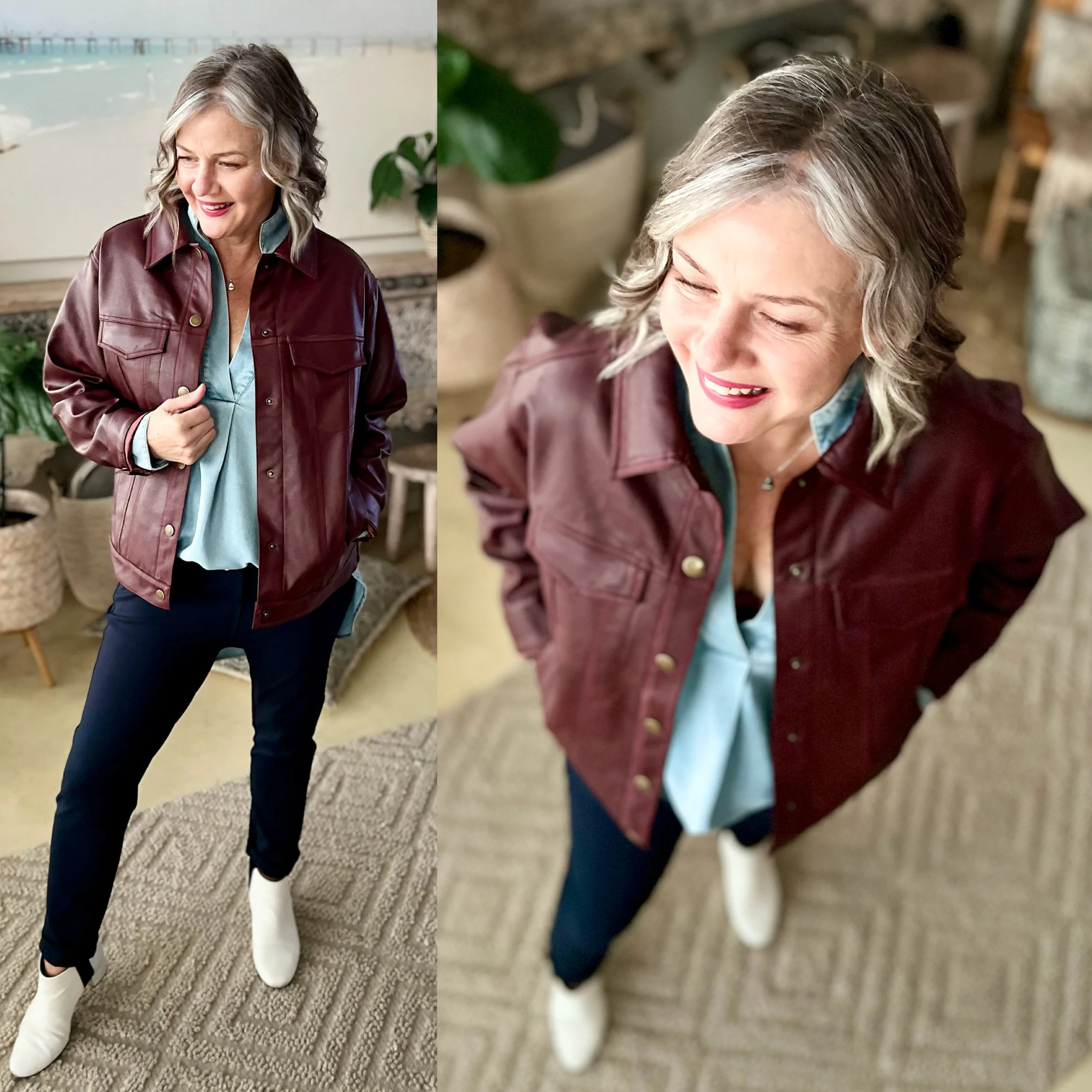When styling a masculine, vintage-inspired jacket, don’t forget the magic of adding a feminine element, be it a delicate gold chain, a slouchy leather handbag, or a pop of blush on the cheek.