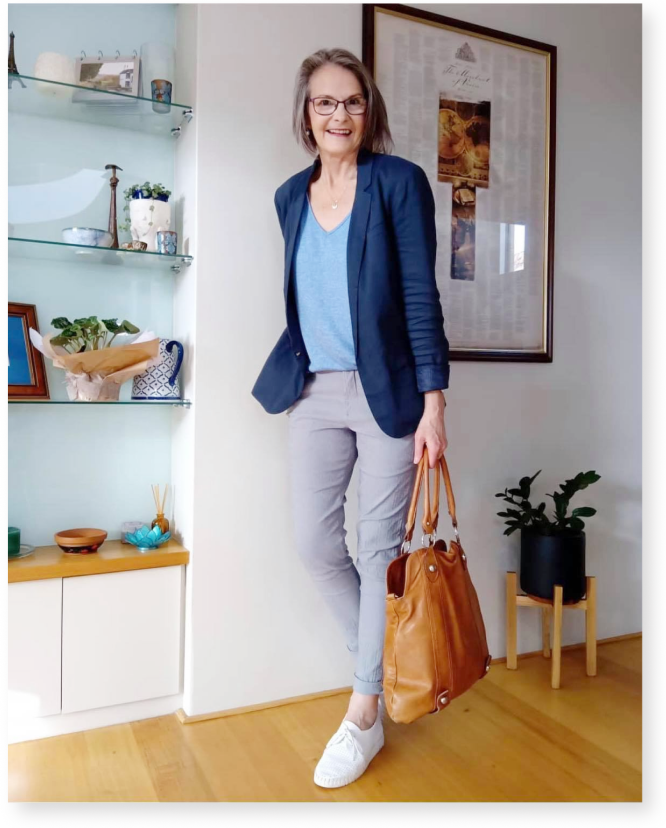 Knowing this I can put together colour combinations, prints and styles that I feel great wearing. At age 61 I feel better about myself than ever. My wardrobe has transitioned with me even though I’m no longer working.